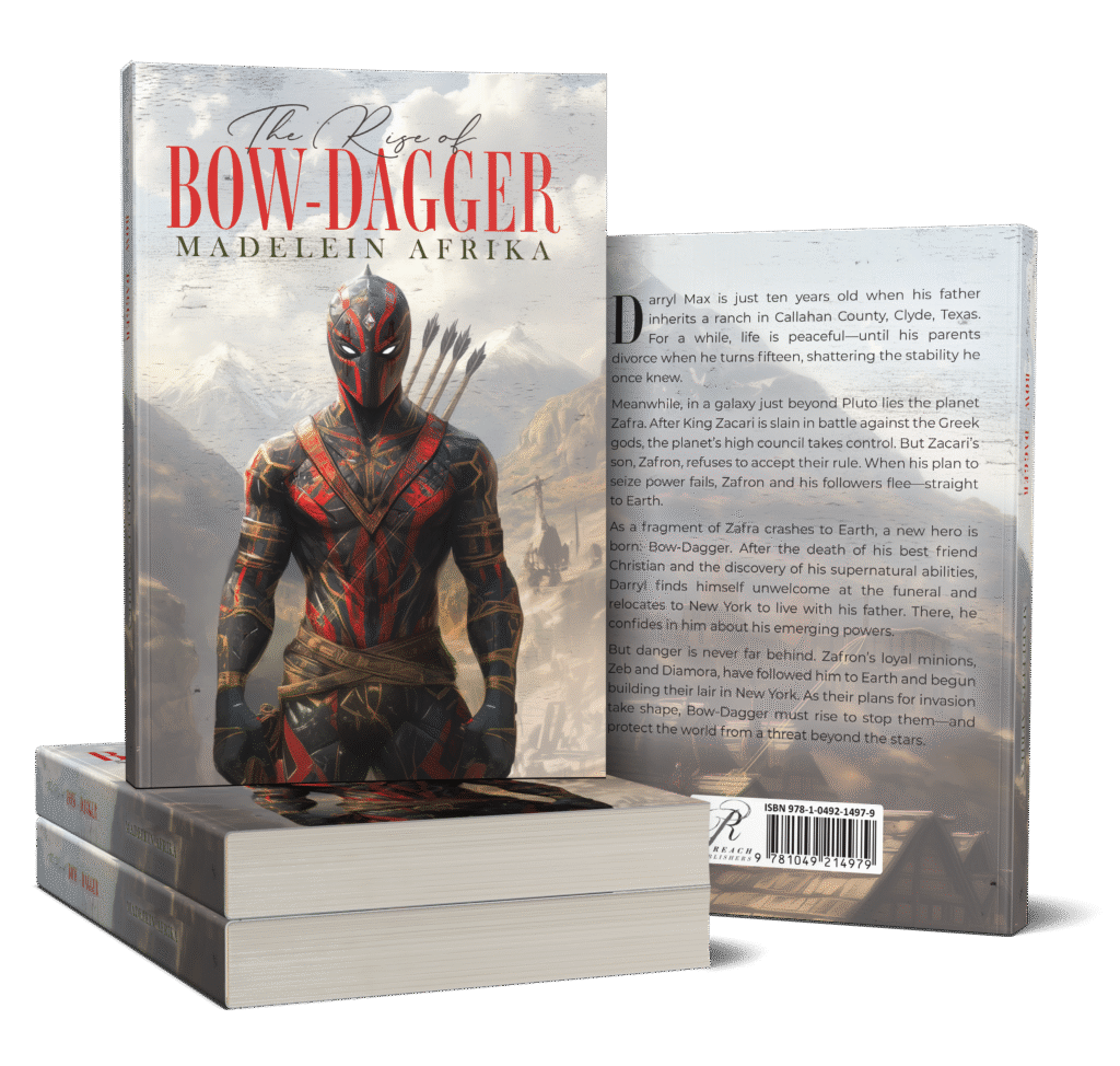 Darryl Max is just ten years old when his father inherits a ranch in Callahan County, Clyde, Texas. For a while, life is peaceful—until his parents divorce when he turns fifteen, shattering the stability he once knew. Meanwhile, in a galaxy just beyond Pluto lies the planet Zafra. After King Zacari is slain in battle against the Greek gods, the planet’s high council takes control. But Zacari’s son, Zafron, refuses to accept their rule. When his plan to seize power fails, Zafron and his followers flee—straight to Earth. As a fragment of Zafra crashes to Earth, a new hero is born: Bow-Dagger. After the death of his best friend Christian and the discovery of his supernatural abilities, Darryl finds himself unwelcome at the funeral and relocates to New York to live with his father. There, he confides in him about his emerging powers. But danger is never far behind. Zafron’s loyal minions, Zeb and Diamora, have followed him to Earth and begun building their lair in New York. As their plans for invasion take shape, Bow-Dagger must rise to stop them—and protect the world from a threat beyond the stars.